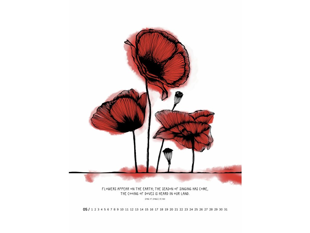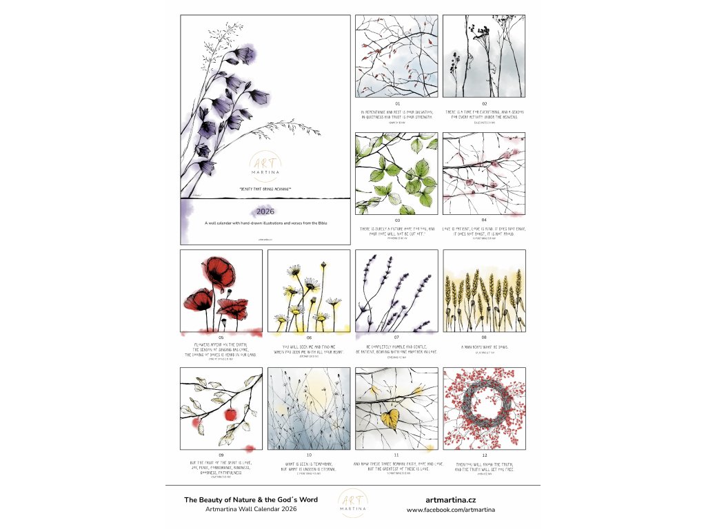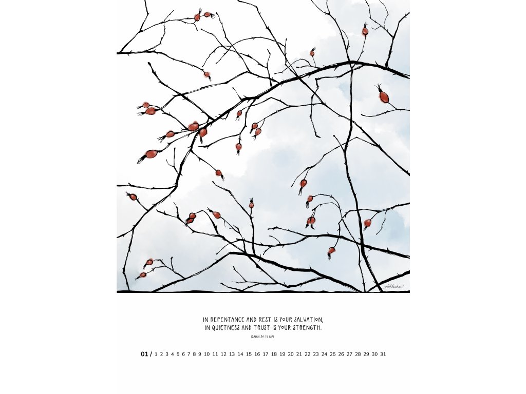 Each month brings a delicate drawing inspired by the changing seasons – from the first buds to frost-covered branches. The illustrations are hand-drawn in pen and watercolor, with an emphasis on contrast, detail, and space for quiet. Every motif is accompanied by a verse from the Bible (New International Version – NIV), connecting outer beauty with an inner message.